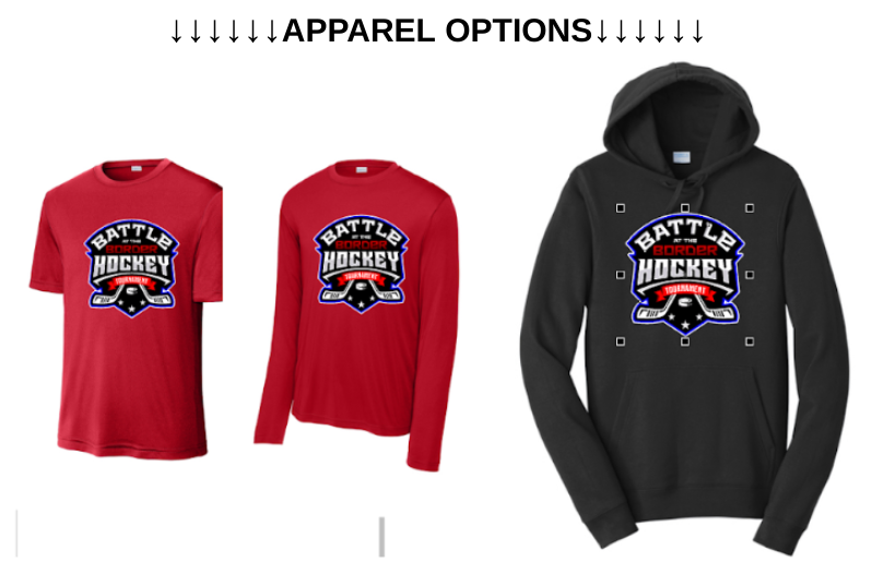 Please complete this registration if you wish to purchase apparel for the upcoming 10U Battle at the Border Tournament. We are offering a RED Short-Sleeve Shirt, a RED Long-Sleeve Shirt and a BLACK Long Sleeve Hoodie in youth and adult sizes. Please refer to the sample apparel pictures below before you proceed! Other apparel information is listed below the apparel pictures.